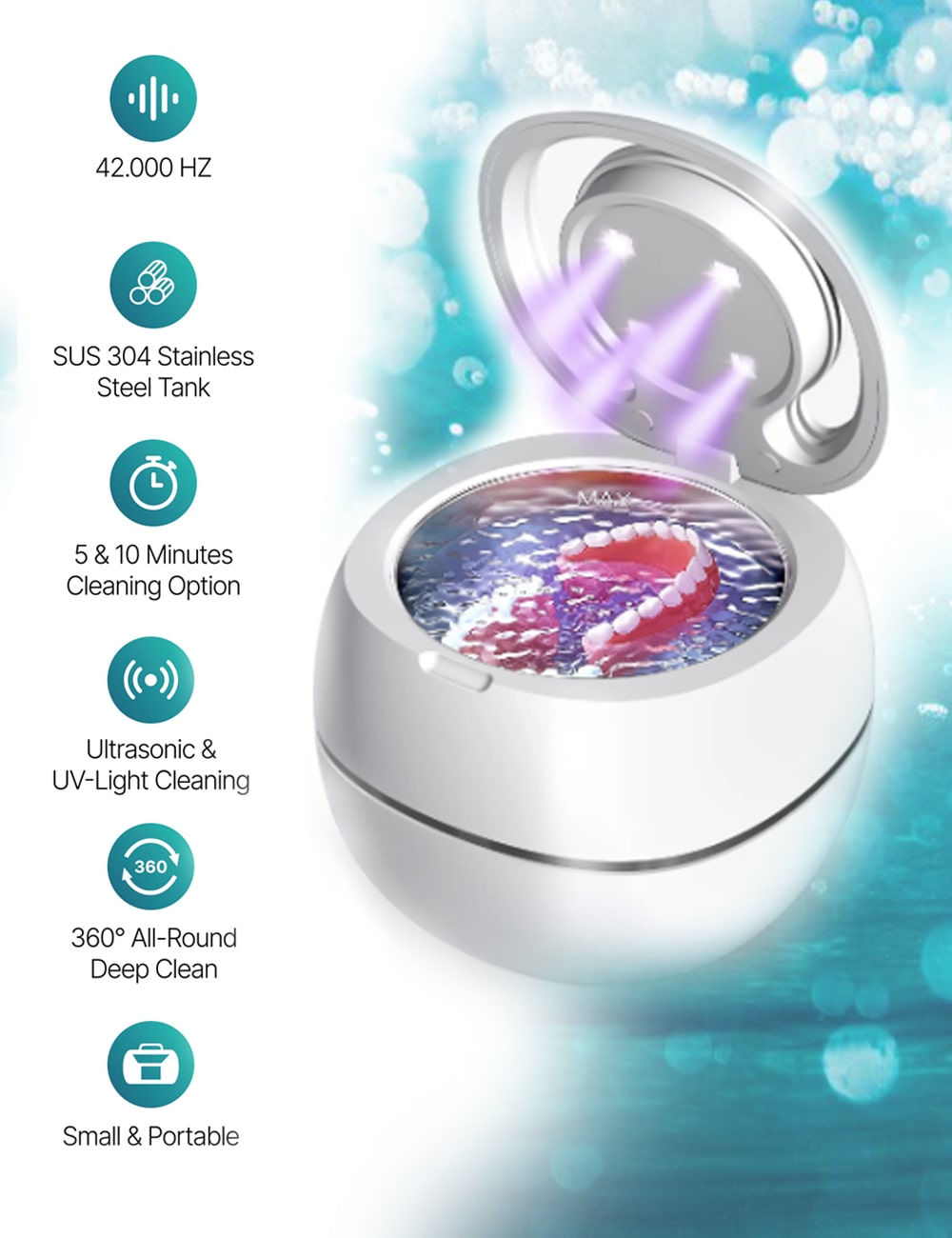 Tout ce qui est étanche et qui tient dans le récipient. La plupart des utilisateurs utilisent le Sonic & Light Pro pour leurs Facettes-Dentaires, leurs gouttières anti-grincement ou leurs appareils dentaires. Mais tu peux également l'utiliser pour nettoyer les têtes de brosse à dents ou tes bijoux. Attention, ne mets rien dans le récipient qui puisse rouiller ou qui ne soit pas étanche.